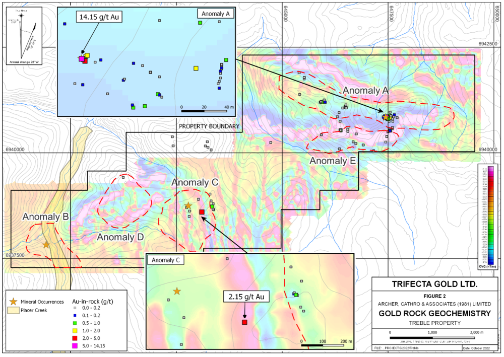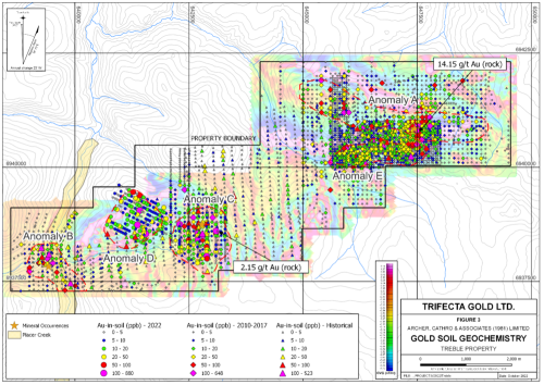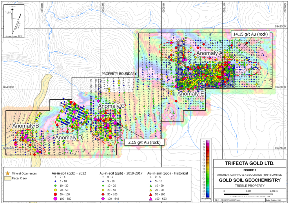 November 21, 2022 - Trifecta Gold Ltd. (TSX-V: TG) (“Trifecta” or the “Company”) is pleased to announce results from recent work at its 100% owned Treble project, located in the Dawson Range Gold Belt of west central Yukon.