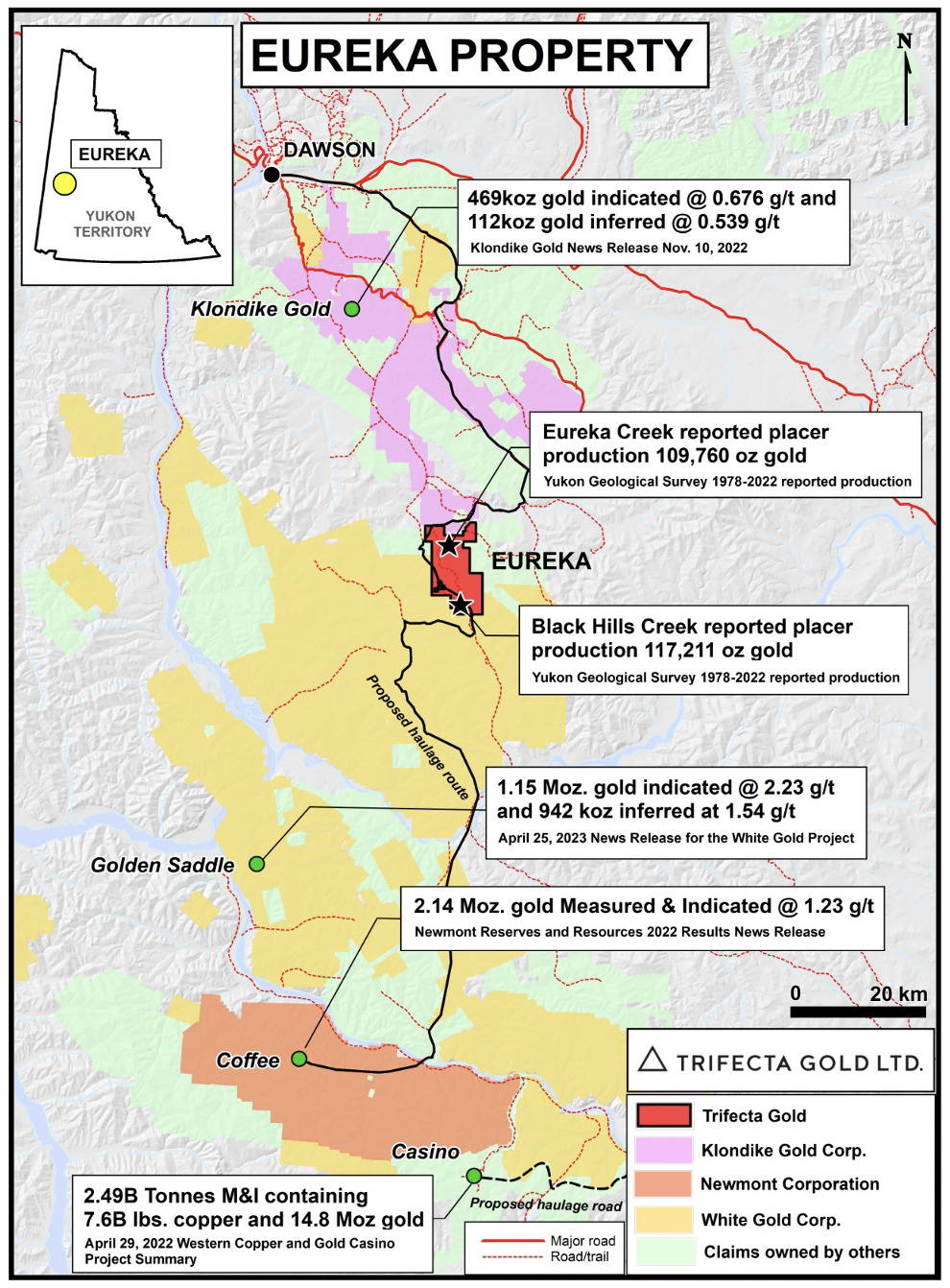 June 7, 2023 - Trifecta Gold Ltd. (TSX-V: TG) (“Trifecta” or the “Company”) is pleased to announce 2023 plans for two of its 100% owned gold projects located in the Dawson Range Gold Belt of west central Yukon. The Company was awarded Yukon Mineral Exploration Program (YMEP) grants for Target Evaluation at both the Eureka and Treble projects. Under the YMEP the Yukon Government provides successful applicants funding to support mineral exploration activities for 50% of eligible expenditures to a maximum of $50,000.