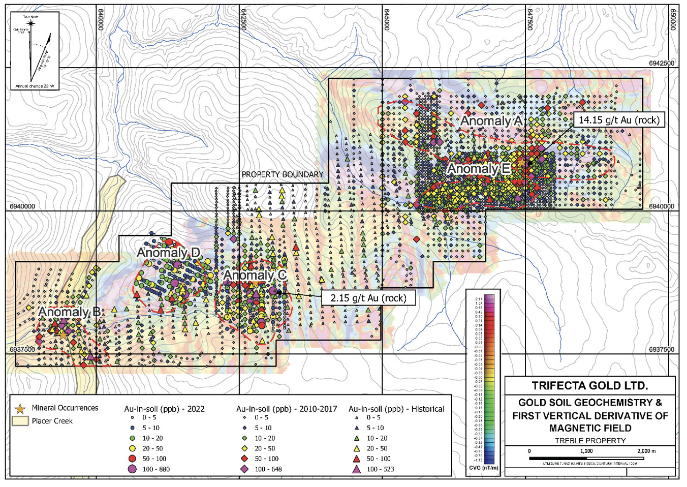 The five strong geochemical anomalies identified on the property comprise highly elevated gold, arsenic, antimony, copper, and molybdenum-in-soil geochemical responses. Anomalies A, C and E are spatially coincident with geophysical anomalies in which magnetic highs interpreted as Late Cretaceous intrusions are surrounded by magnetic lows, (see figure below).