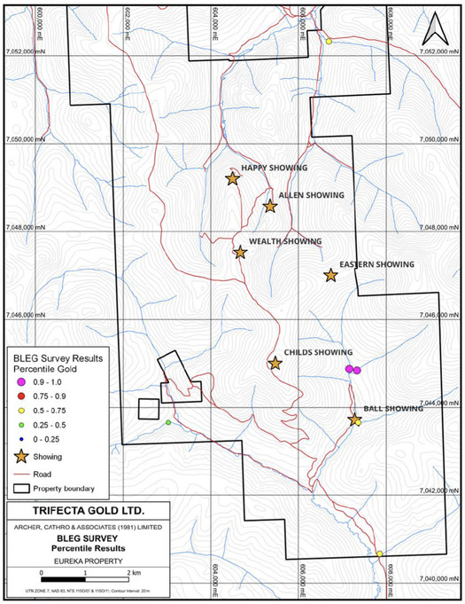 April 4, 2024 - Trifecta Gold Ltd. (TSX-V: TG) (OTCQB: TRRFF) (“Trifecta” or the “Company”) is pleased to report results of a regional Bulk Leach Extractable Gold (“BLEG”) survey conducted in 2023 by Newmont Canada, which included the area covering the Company’s 100% owned, road accessible Eureka Project. Multiple sample sites on the Company’s Eureka Project returned 99th percentile results for gold and other pathfinder elements characteristic of orogenic gold deposits.