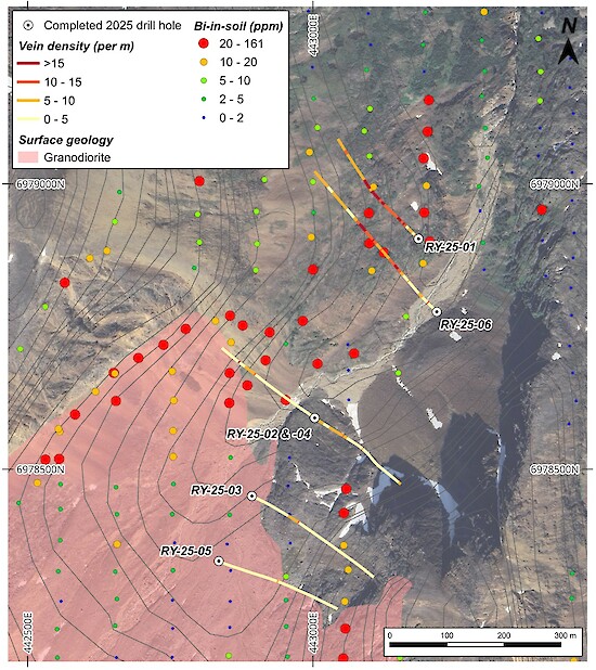 Figure 1 – Map of completed 2025 diamond drill holes at Rye, along with drill hole vein density illustrated thematically and soil sample results for bismuth