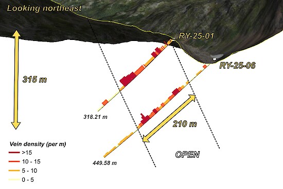 Figure 2 – Cross-section of holes RY-25-01 and RY-25-06, with drill hole vein density illustrated thematically