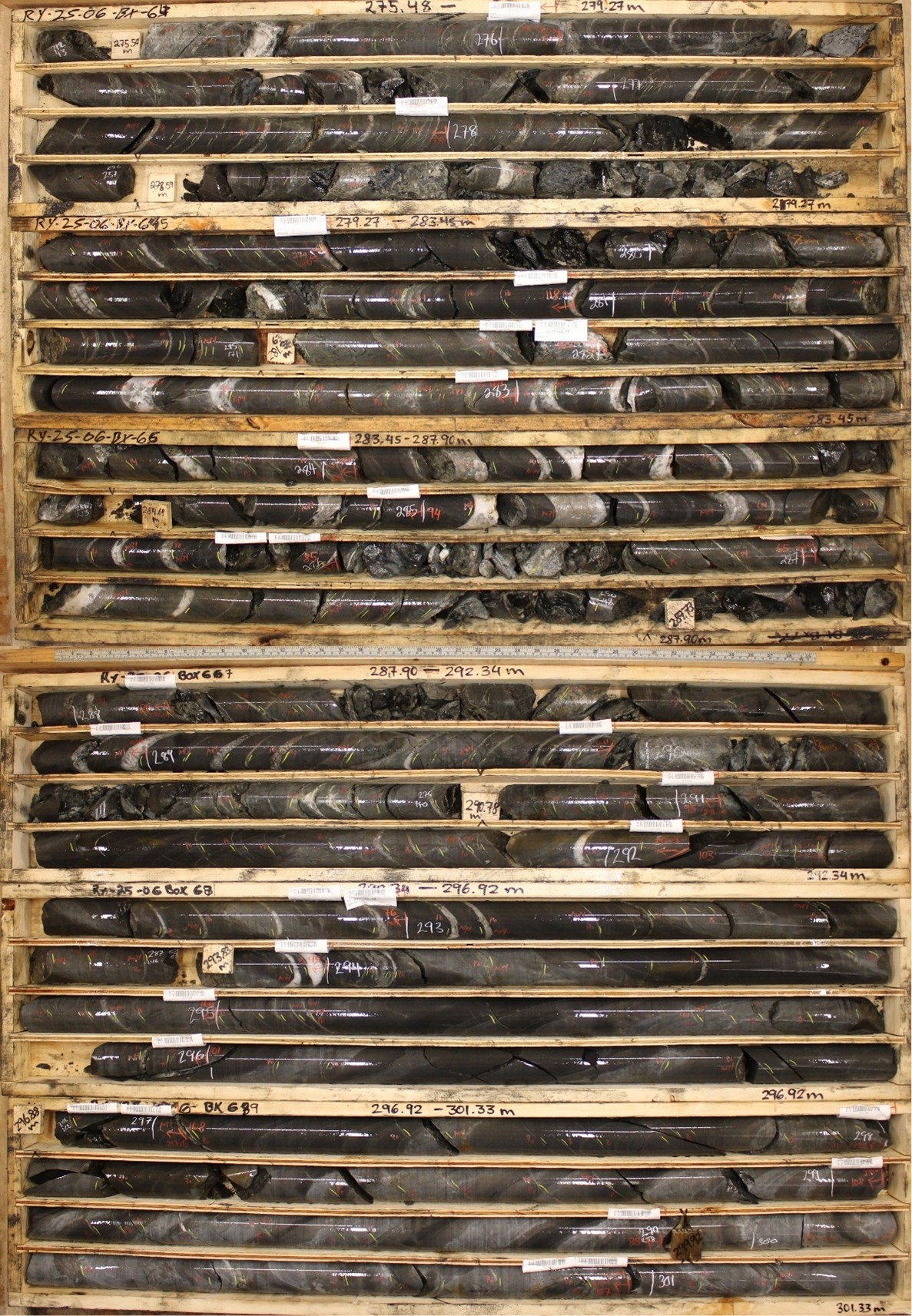 Figure 3 – Drill core from hole RY-25-06, between 275.48 and 301.33 m, where the average measured sheeted vein density is >15 per metre