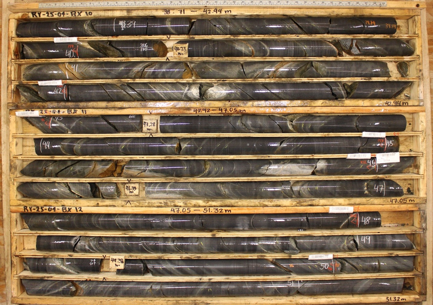 Figure 4 – Drill core from hole RY-25-04, between 38.71 and 51.32 m, where the average measured sheeted vein density is 7 per metre comprising qtz-pyrite+/-carbonate and qtz-pyrite-pyrrhotite
