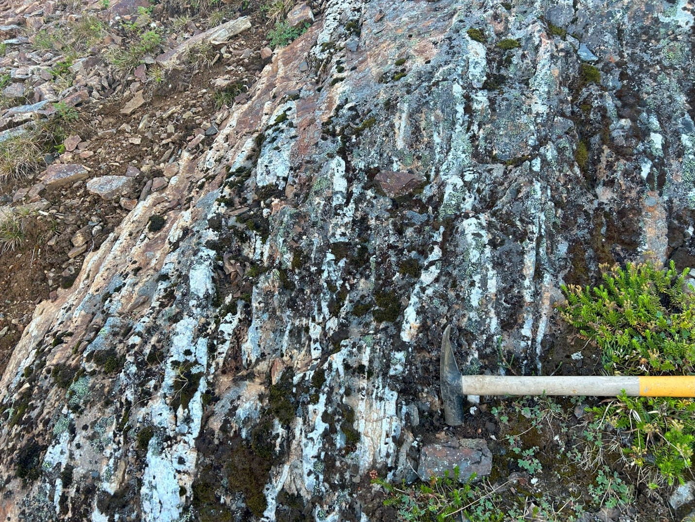 The Rye Project is located in eastern Yukon, 14 km south of the North Canol Road, an unpaved, government-maintained highway. Work in 2024 outlined an intense, 500 x 200 m gold-, bismuth-, and tellurium-in-soil anomaly overlying the contact zone of a mapped Tombstone Gold Belt reduced intrusion and surrounding hornfels. Sheeted quartz veining is observed both within the intrusion and surrounding hornfels and vein specimen samples have yielded up to 8.37 g/t gold and 1965 ppm bismuth.