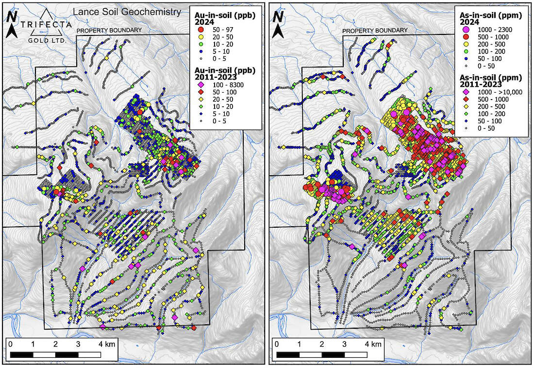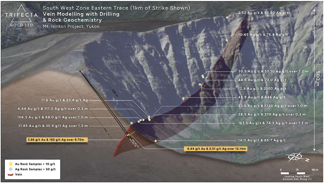 During 2024, drill sites and access trails were constructed to facilitate step-out drilling at two prominent vein trends. Field crews also expanded property-scale mapping and geochemical sampling. Trifecta believes that the gold and pathfinder element geochemistry in coordination with geological observations and age dating is highly suggestive of Mt. Hinton's proximity to a reduced granitic intrusion of the type responsible for other RIRGS deposits in the district. Preliminary data from a 2024 ZTEM survey identified a large resistive feature in the floor of Granite Creek. A subsequent 3D inversion of the data modeled the magnetic amplitude of a concomitant magnetic feature, closely matching the magnetic amplitude of other known RIRGS intrusions, including Snowline's Valley Deposit. Late-season prospecting discovered granitic rocks at the site of the strongest resistive feature, now known as the GC Target. The GC Target, straddling an existing road, represents a high-priority RIRGS drill target for 2025 that compliments the existing vein targets.
