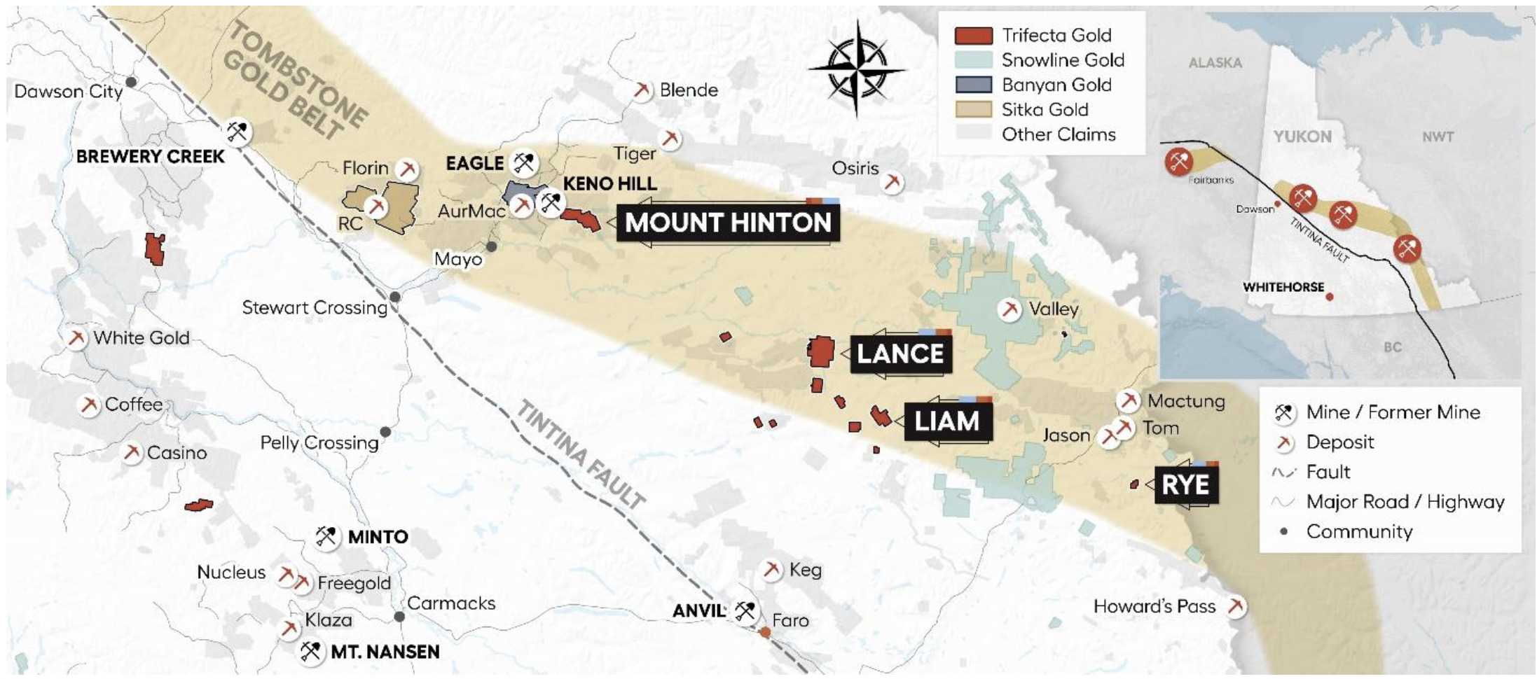 February 6, 2025 - Trifecta Gold Ltd. (TSX-V: TG) (OTCQB:TRRFF) (“Trifecta” or the “Company”) is pleased to highlight exploration results from 2024, initial plans for 2025 and upcoming marketing efforts. 2024 was a transformational year for Trifecta, after obtaining a US listing with OTC Markets to broaden the investor base, the Company then secured an option to acquire 11 projects representing a large footprint within the Yukon portion of the Tombstone Gold Belt (“TGB”) (Figure 1). The Tombstone Gold Belt mining district hosts several significant Reduced Intrusion-Related Gold System (“RIRGS”) mines and deposits, such as Fort Knox in Alaska (>10 million oz), Eagle and Olive in Yukon (>4 million oz) and the past-producing Brewery Creek Mine, also in Yukon. Recent advances include the discovery of Snowline Gold Corp.’s Valley Deposit, which hosts over 7 million ounces of gold, and updated mineral resource estimates at Banyan Gold Corp.’s AurMac Project (7 million oz) and Sitka Gold Corp.’s RC Project (2.8 million oz). Trifecta has positioned itself as a leading explorer in the region and is pleased to report exploration progress and upcoming plans for three of the projects.