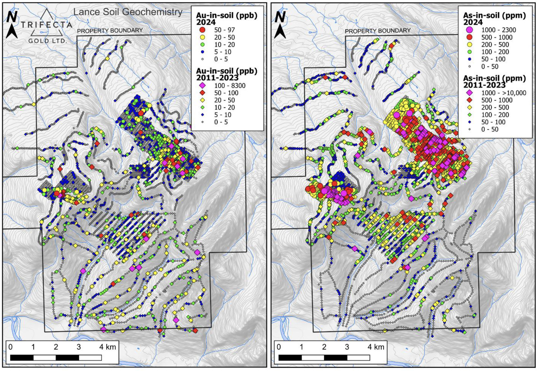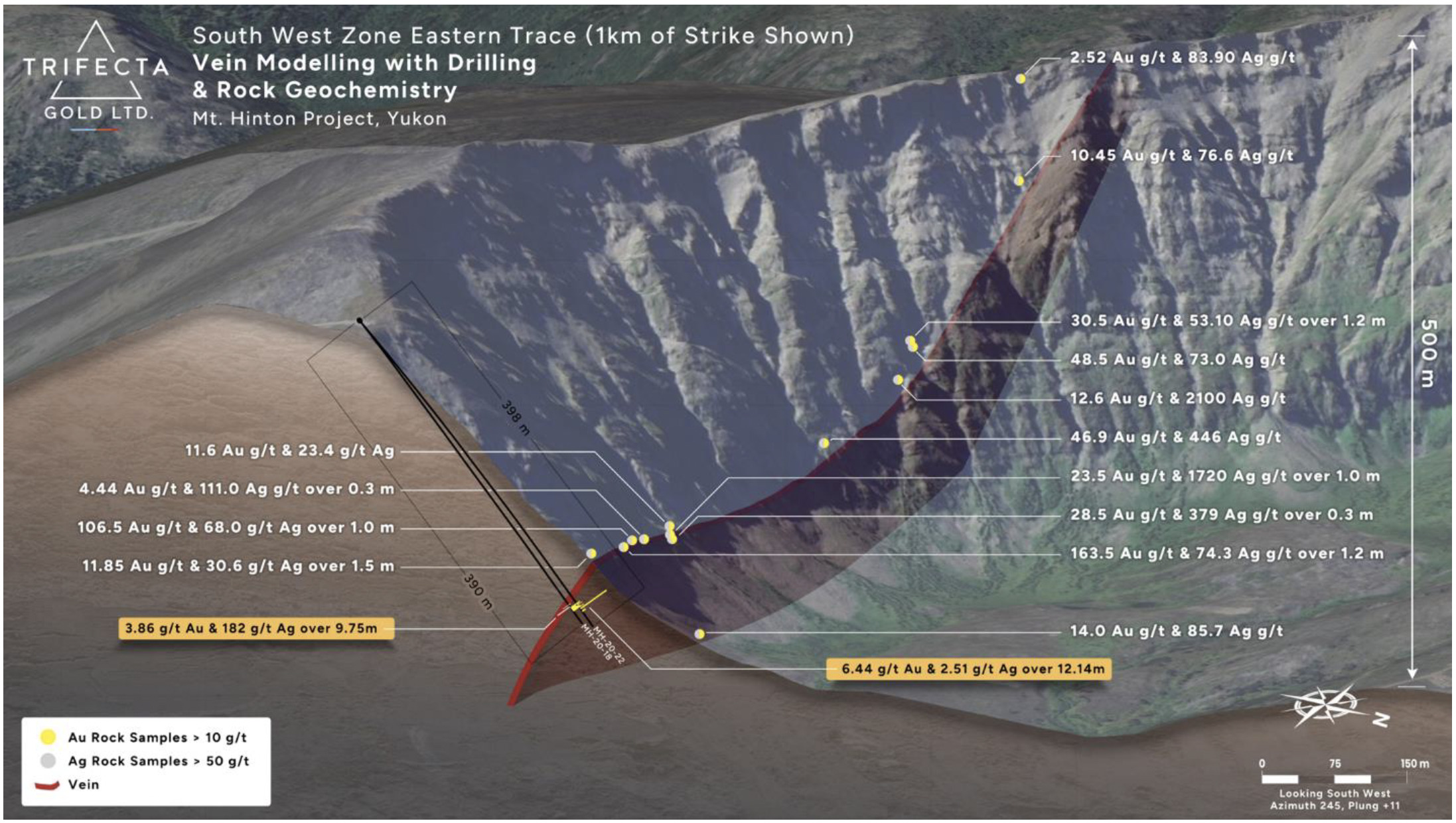 During 2024, drill sites and access trails were constructed to facilitate step-out drilling at two prominent vein trends. Field crews also expanded property-scale mapping and geochemical sampling. Trifecta believes that the gold and pathfinder element geochemistry in coordination with geological observations and age dating is highly suggestive of Mt. Hinton's proximity to a reduced granitic intrusion of the type responsible for other RIRGS deposits in the district. Preliminary data from a 2024 ZTEM survey identified a large resistive feature in the floor of Granite Creek. A subsequent 3D inversion of the data modeled the magnetic amplitude of a concomitant magnetic feature, closely matching the magnetic amplitude of other known RIRGS intrusions, including Snowline's Valley Deposit. Late-season prospecting discovered granitic rocks at the site of the strongest resistive feature, now known as the GC Target. The GC Target, straddling an existing road, represents a high-priority RIRGS drill target for 2025 that compliments the existing vein targets.
