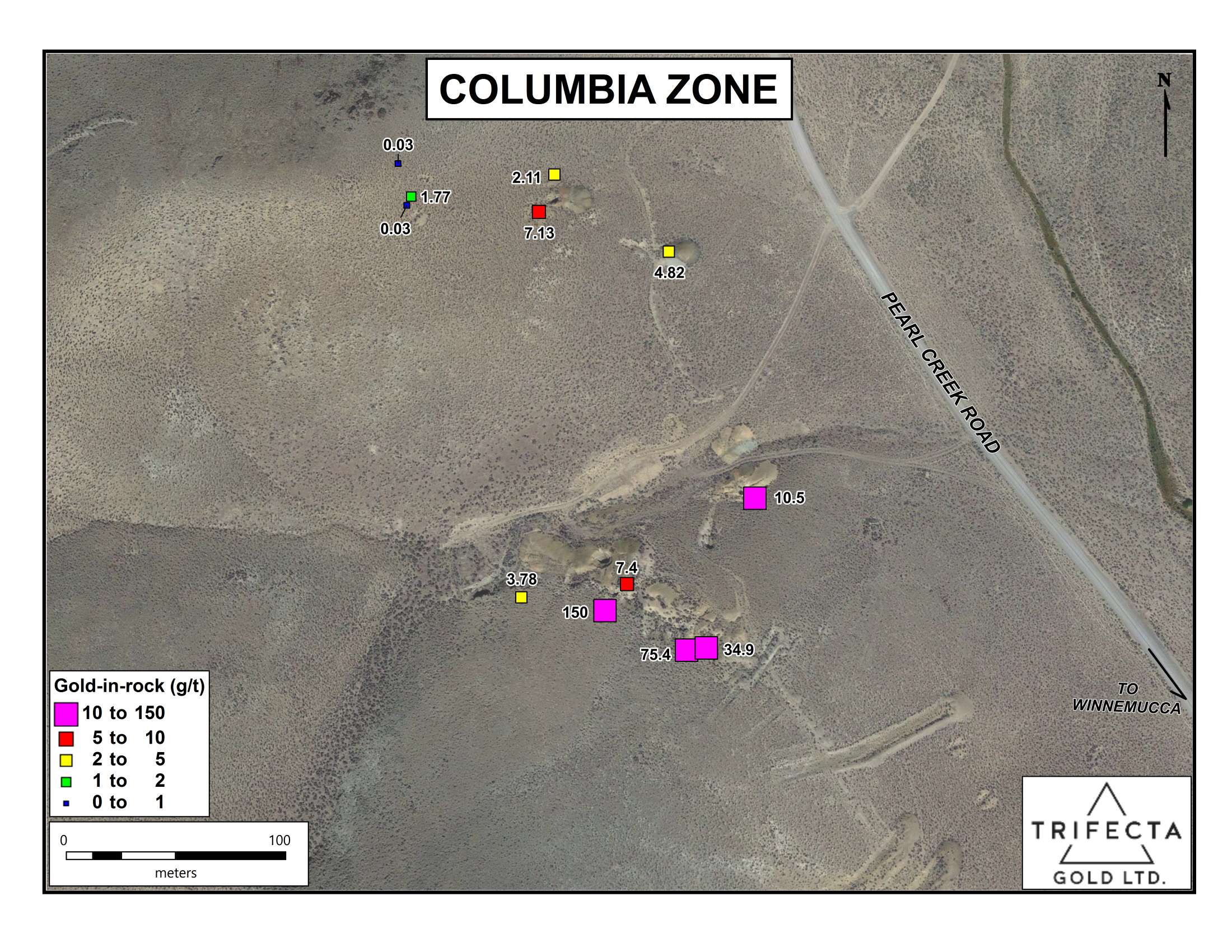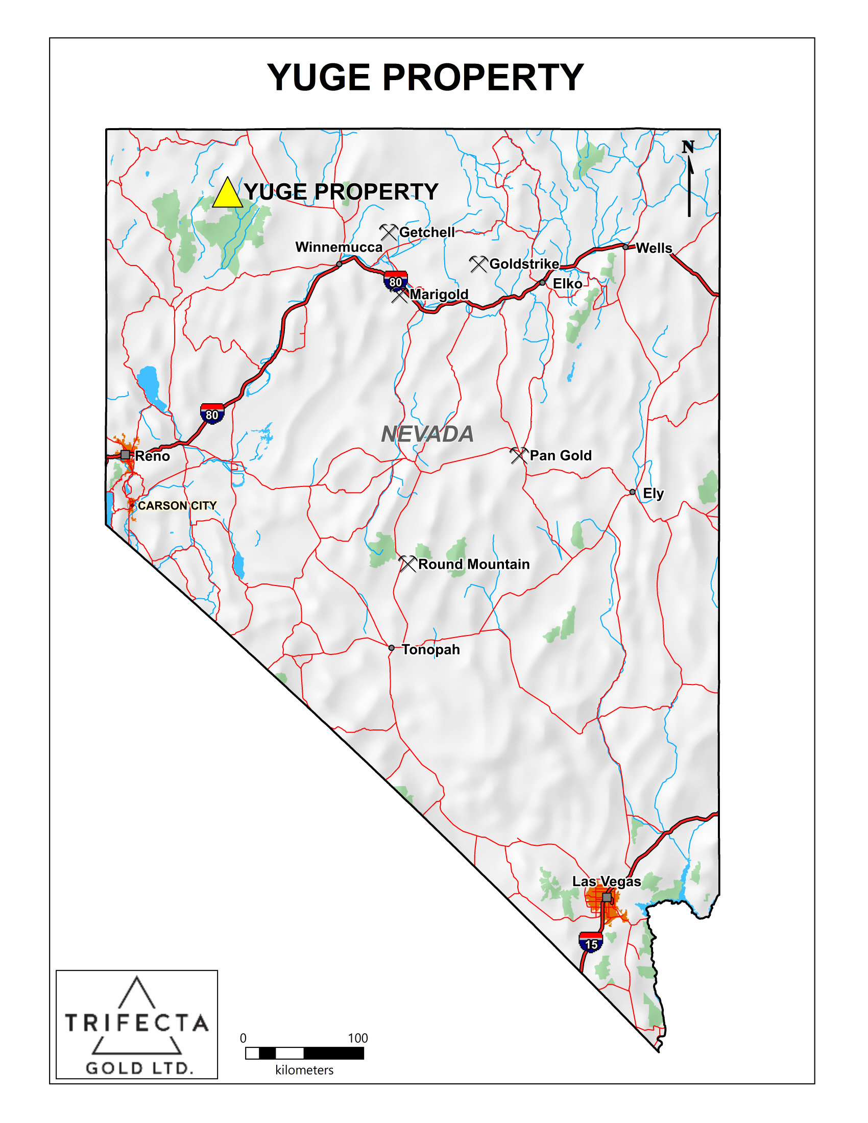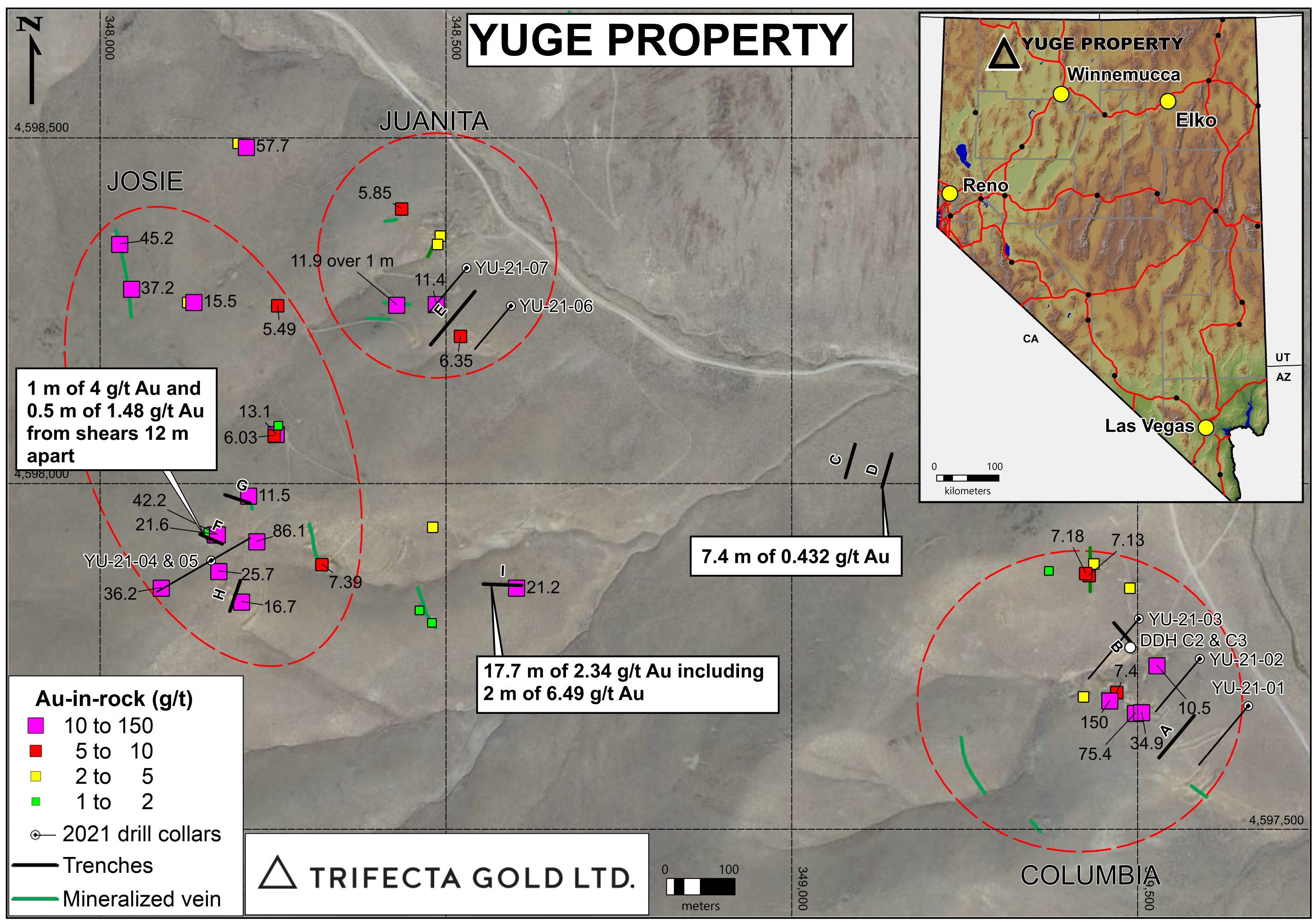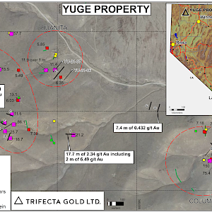 The Yuge property is located in Humboldt County, northern Nevada, approximately 55 km south of Denio in the Varyville Mining District. The property covers the historical Columbia and Juanita Mines, which produced high-grade gold on a small scale between 1870 and 1937 from strong veins located more than 1,000 m apart within the same structural corridor. Historical mining only extended down to the bottom of the oxidized zone. Diamond drilling by previous operators below the Columbia workings produced a true-width sulphide intersect, which graded 9.70 g/t gold over 3.3 m starting 49 m below surface. This drilling was conducted in 1981 and no further drilling was been completed until Trifecta acquired the project from Silver Range Resources.