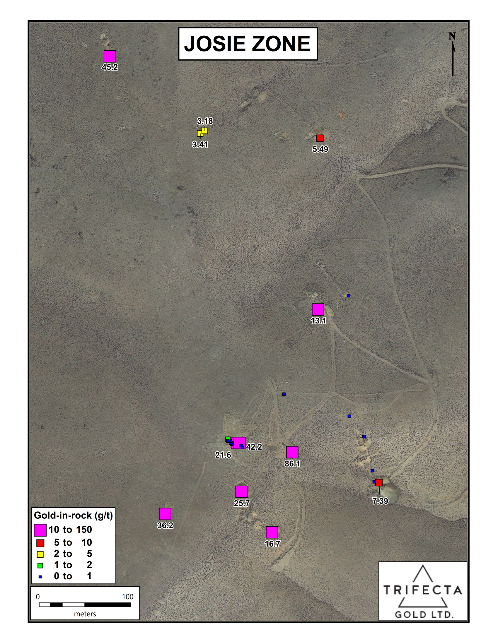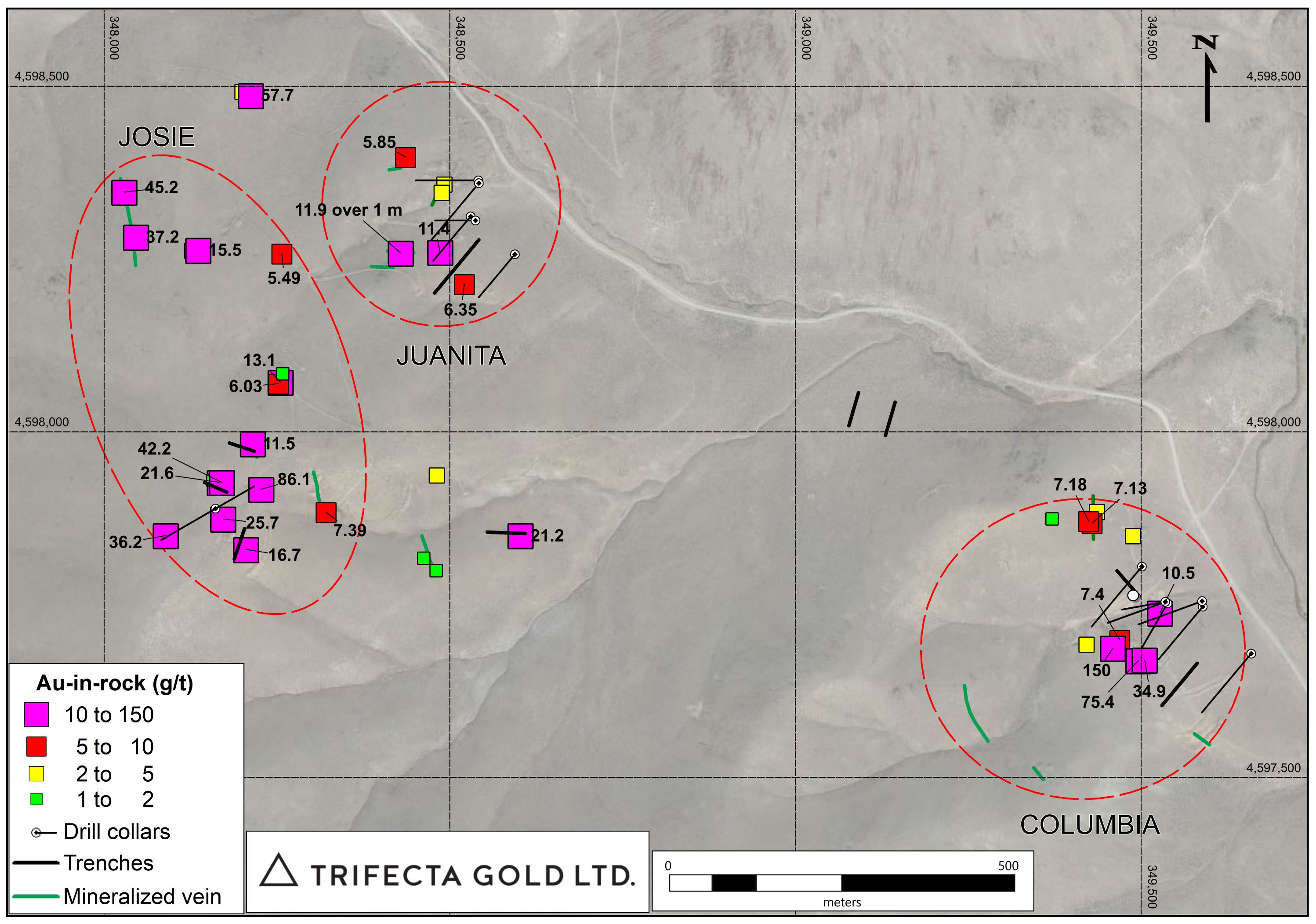 The Josie target is a large area located south of the former Juanita Mine that contains scattered historical diggings, which Trifecta is evaluating for its bulk tonnage potential. Mineralization at the Josie target was collected over a 500 m long by up to 200 m wide area, from structures that trend oblique to the Columbia/Juanita system. Most samples at Josie were taken from vein exposures or float, but a 2 m chip sample, mapped as weathered ‘andesite’ with minor iron oxide, contained 1.84 g/t gold. Two significant chip samples of vein exposures from partially collapsed trenches graded 45.2 g/t gold over 0.35 m and 42.2 g/t gold over 0.4 m, respectively. The limits of the Josie target have not been defined.