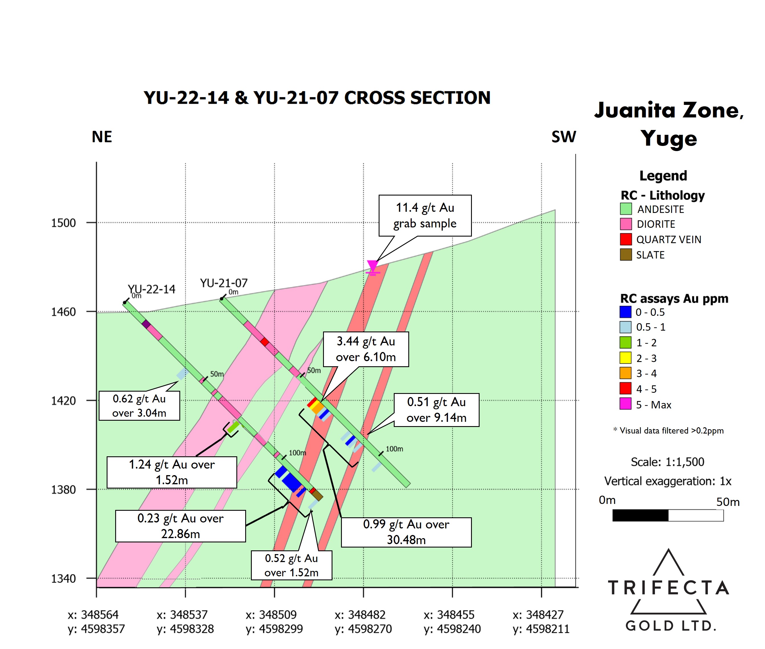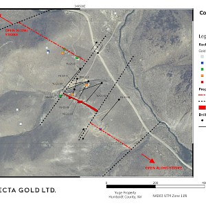 The Juanita target hosts various underground workings and the Juanita Mine, which was once owned and operated by notable Nevadan prospector Josie Pearl. Many of the previous workings have yet to be mapped and sampled. Surface sampling at Juanita has returned grab samples grading 57.7 g/t gold and 11.4 g/t gold while a shear zone exposed in a nearby road cut graded 11.9 g/t gold over 1 m. Drilling by Trifecta gold has targeted mineralization to the south of the main shaft, intersecting: