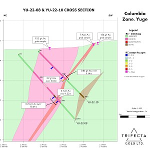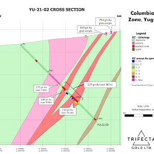 Mineralization remains open to depth, and mineralizing systems of this character often extend to great depths. Columbia also remains open along strike as the most southerly hole drill hole, YU-21-01, was abandoned short of target depth. The most northerly hole, YU-21-03, was drilled on the north side of a cross fault that appears to offset the Columbia Zone approximately 160 metres to the northeast. Surface grab samples collected along the projected northern extension of Columbia, 100 m along strike to the northeast of hole YU-21-03, have returned assays including 7.18 and 7.13 g/t. In addition, Trench D retuned 7.4 m of 0.43 g/t gold 420 m along strike from YU-21-03.
