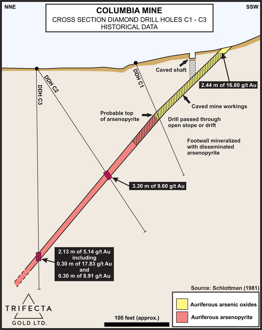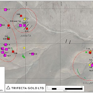 At Columbia, multiple drill holes completed by Trifecta have confirmed that a broad envelope of gold mineralization flanks the high-grade vein identified by historical miners at Columbia and that a second high-grade vein parallels the structure targeted by historical miners. Highlight intervals include: